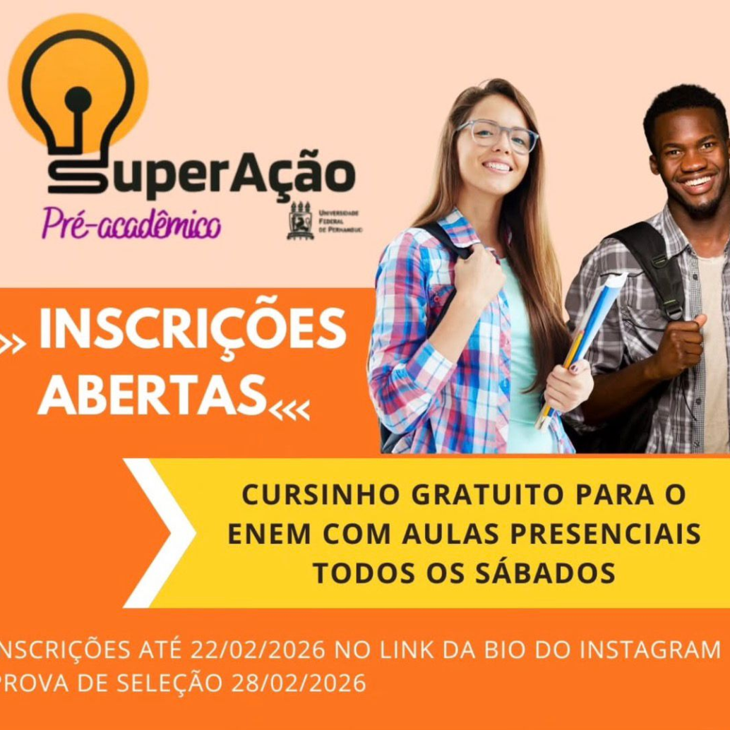 Estão abertas as inscrições para o SuperAção 2026, cursinho pré-acadêmico gratuito voltado à preparação de estudantes do 3º ano do Ensino Médio da rede estadual para o Exame Nacional do Ensino Médio (Enem). A iniciativa é ofertada pela Universidade Federal de Pernambuco (UFPE), no Centro Acadêmico do Agreste (CAA), em Caruaru. Os interessados podem se inscrever até o dia 22 de fevereiro pela internet. A seleção dos candidatos será feita por prova, marcada para o dia 28 de fevereiro.