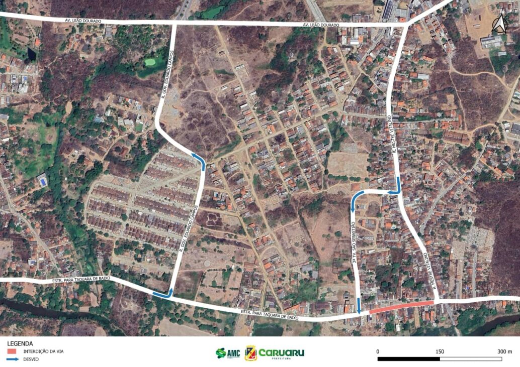 A Autarquia de Mobilidade de Caruaru (AMC) anunciou que, a partir desta segunda-feira (16), parte da Estrada para Taquara de Baixo, no bairro Alto do Moura, ficará interditada devido a uma intervenção da Companhia Pernambucana de Saneamento (Compesa).