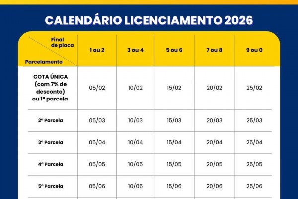 O pagamento poderá ser feito em até dez parcelas mensais, desde que cada cota tenha valor mínimo de R$ 54,78. A cobrança começa em fevereiro, com vencimentos entre os dias 5 e 25, de acordo com o final da placa. Quem optar pelo pagamento em cota única até fevereiro terá desconto de 7%.