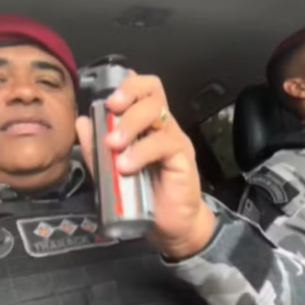 Nas imagens, o oficial aparece em tom descontraído e, antes de acionar o dispositivo, afirma: “Vamos cheirar um gasinho aqui todo mundo, pra ver se dá certo nessa segunda-feira”. Em seguida, o spray é disparado diversas vezes no interior do veículo, atingindo os três agentes.